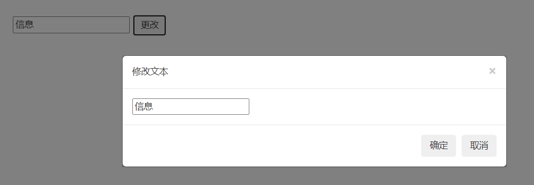 <!DOCTYPE html> <html> <head> <meta charset="utf-8"> <link href="css/bootstrap.min.css" rel="stylesheet" /> <script src="js/jquery-1.12.4.js" type="text/javascript"></script> <script src="js/bootstrap.min.js" type="text/javascript"></script> <title></title> <script type="text/javascript"> $(function(){ $("#update").click(function(){ var a=$("#text1").val(); $("#text2").val(a); $("#myModal").on("on.bs.modal",function(){ }) }); $("#ok").click(function(){ var a=$("#text2").val(); $("#text1").val(a); $("#myModal").on("hidden.bs.modal",function(){ }).modal("hide"); }) }) </script> </head> <body> <div class="container" style="margin-top: 100px;"> <input type="text" readonly value="信息" id="text1" /> <button class="btn" id="update" data-toggle="modal" data-target="#myModal">更改</button> <div class="modal modal-dialog" id="myModal"> <div class="modal-content"> <div class="modal-header"> <div class="close text-right" data-dismiss="modal">×</div> <div class="modal-title">修改文本</div> </div> <div class="modal-body"> <input type="text" id="text2"/> </div> <div class="modal-footer"> <button id="ok" class="btn">确定</button> <button class="btn" data-dismiss="modal">取消</button> </div> </div> </div> </div> </body> </html>