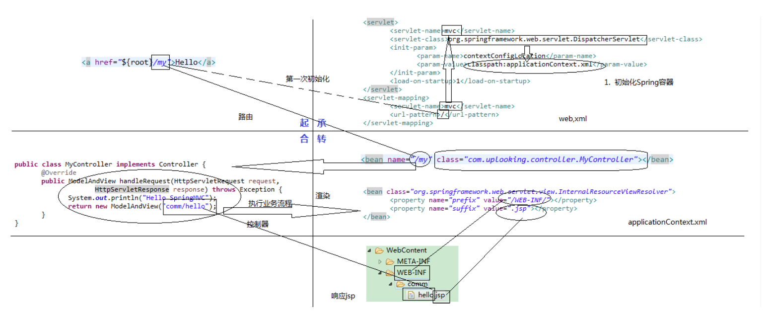 3)Spring容器 applicationContext.xml <?xml version="1.0" encoding="UTF-8"?> <beans xmlns="http://www.springframework.org/schema/beans" xmlns:context="http://www.springframework.org/schema/context" xmlns:mvc="http://www.springframework.org/schema/mvc" xmlns:xsi="http://www.w3.org/2001/XMLSchema-instance" xsi:schemaLocation="http://www.springframework.org/schema/beans http://www.springframework.org/schema/beans/spring-beans-3.0.xsd http://www.springframework.org/schema/context http://www.springframework.org/schema/context/spring-context-3.0.xsd http://www.springframework.org/schema/mvc http://www.springframework.org/schema/mvc/spring-mvc-3.0.xsd"> <context:component-scan base-package="com.uplooking.controller"></context:component-scan> <bean class="org.springframework.web.servlet.view.InternalResourceViewResolver"> <property name="prefix" value="/WEB-INF"></property> <property name="suffix" value=".jsp"></property> </bean> </beans>