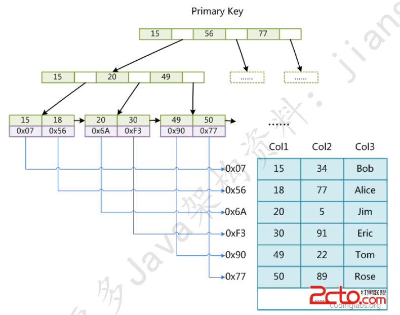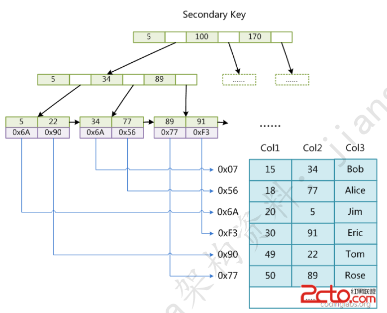 而辅助索引的key可以重复。如果我们在Col2上建立一个辅助索引,则此索引的结构如下图所示: