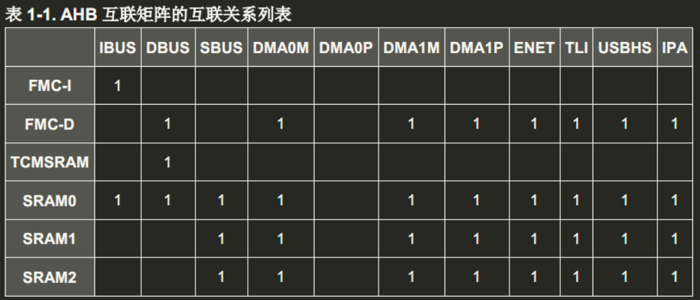 APB总线直连内核,dma,ram,flash并通过APB总线间接和外设相连,具体连接关系在系统框架图中展示。不是挂在AHB总线上的任意2个不同的电路模块间都可以通信,而是要满足总线矩阵的要求,即必须要一主一从且这对主从间存在连接才可以。表1-1 中行表示AHB总线的master电路模块,列表示AHB总线的slave电路模块(截图不完整)。这里的列单元数和下图中AHB左侧master的个数相等,行单元数和下图中AHB右侧slave的个数相等。且必须是表1-1中标1的一对master-slave间才可以通信。