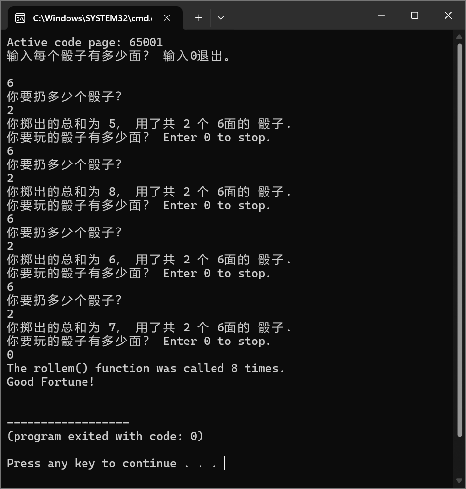 printf("你掷出的总和为 %d, 用了共 %d 个 %d面的 骰子.\n", roll, dice, sides);