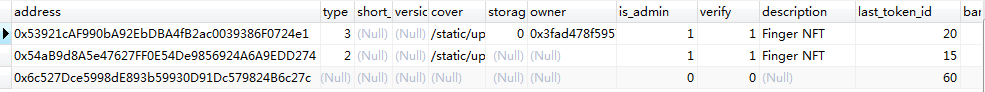 SET NAMES utf8mb4; SET FOREIGN_KEY_CHECKS = 0; -- ---------------------------- -- Table structure for fc_contract -- ---------------------------- DROP TABLE IF EXISTS `fc_contract`; CREATE TABLE `fc_contract` ( `id` bigint(0) NOT NULL AUTO_INCREMENT COMMENT '表id', `name` varchar(1024) CHARACTER SET utf8mb4 COLLATE utf8mb4_0900_ai_ci NULL DEFAULT NULL COMMENT 'nft name', `symbol` varchar(512) CHARACTER SET utf8mb4 COLLATE utf8mb4_0900_ai_ci NULL DEFAULT NULL COMMENT 'nft symbol', `address` varchar(50) CHARACTER SET utf8mb4 COLLATE utf8mb4_0900_ai_ci NULL DEFAULT NULL COMMENT '合约地址', `type` int(0) NULL DEFAULT NULL COMMENT '类型 3:ERC721 2.ERC1155', `short_url` varchar(100) CHARACTER SET utf8mb4 COLLATE utf8mb4_0900_ai_ci NULL DEFAULT NULL COMMENT '短地址', `version` varchar(10) CHARACTER SET utf8mb4 COLLATE utf8mb4_0900_ai_ci NULL DEFAULT NULL COMMENT '合约版本', `cover` varchar(512) CHARACTER SET utf8mb4 COLLATE utf8mb4_0900_ai_ci NULL DEFAULT NULL COMMENT '图标', `storage_id` bigint(0) NULL DEFAULT NULL COMMENT '图标保存Id', `owner` varchar(50) CHARACTER SET utf8mb4 COLLATE utf8mb4_0900_ai_ci NULL DEFAULT NULL COMMENT '合约拥有者', `is_admin` tinyint(1) NULL DEFAULT 0 COMMENT '是否是官方合约', `verify` tinyint(1) NULL DEFAULT 0 COMMENT '是否已验证', `description` varchar(1000) CHARACTER SET utf8mb4 COLLATE utf8mb4_0900_ai_ci NULL DEFAULT NULL COMMENT '合约描述', `last_token_id` bigint(0) NULL DEFAULT 0 COMMENT '上一次增发的tokenId', `banner_url` varchar(512) CHARACTER SET utf8mb4 COLLATE utf8mb4_0900_ai_ci NULL DEFAULT '' COMMENT '封面', `get_info_times` int(0) NULL DEFAULT 0 COMMENT '获取name和symbol次数', `is_royalties` tinyint(1) NULL DEFAULT NULL COMMENT '是否支持版权', `signer` varchar(50) CHARACTER SET utf8mb4 COLLATE utf8mb4_0900_ai_ci NULL DEFAULT NULL COMMENT '签名人账号', `is_sync` tinyint(1) NULL DEFAULT 0 COMMENT '是否已经同步', `deleted` tinyint(1) NULL DEFAULT 0 COMMENT '逻辑删除', `create_time` bigint(0) NULL DEFAULT NULL COMMENT '创建时间', `update_time` bigint(0) NULL DEFAULT NULL COMMENT '更新时间', PRIMARY KEY (`id`) USING BTREE, INDEX `index2`(`address`) USING BTREE, INDEX `index3`(`symbol`) USING BTREE ) ENGINE = InnoDB AUTO_INCREMENT = 3 CHARACTER SET = utf8mb4 COLLATE = utf8mb4_0900_ai_ci ROW_FORMAT = Dynamic; SET FOREIGN_KEY_CHECKS = 1;