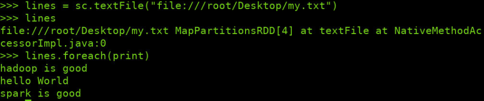 >> lines = sc.textFile("file://root/DesKtop/my.txt") >> lines >> lines.foreach(print)