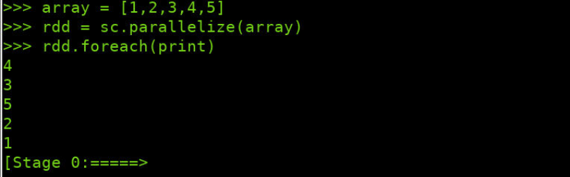 >>> data = [1,2,3,4,5] >>> rdd = sc.parallelize(data) >>> rdd.foreach(print)