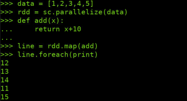 >>> data = [1,2,3,4,5] >>> rdd1 = sc.parallelize(data) >>> rdd2 = rdd1.map(lambda x:x+10) >>> rdd2.foreach(print)