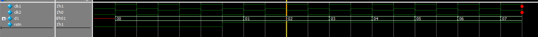 clk2是用一个组合逻辑跟着clk1跳转的,所以clk2要比clk1晚一个Δcycle(45ns+0→45ns+1,"1"代表一个Δcycle),d1同理,所以clk2与d1是同步的。