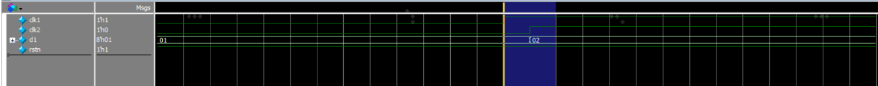 在“45ns+0(delta-cycle)”处,clk1=1,clk2=0,d1=1