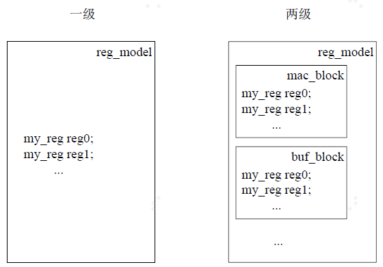 一些环境中只是把一些寄存器加入到uvm_reg_block中,然后在最后的env中例化此reg_block。在现实应用中,一般的会把个uvm_reg_block再加入到一个uvm_reg_block中上,然后在env中例化后者。从逻辑关系上看,呈现出的是两级的register model,如图所示: