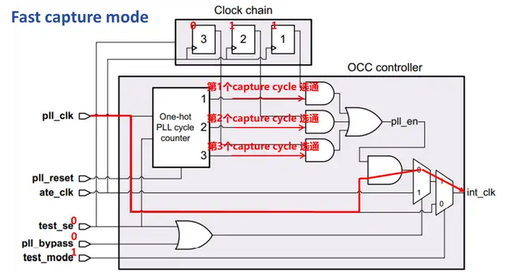 当OCC处于fast capture mode时,期望在capture阶段生成两个function clock脉冲。所以test mode = 1,scan_en = 0,pll_bypass = 0,此时pll _clk选通,并且PLL cycle counter 和clock chain的输出经过ICG共同决定gating几个时钟脉冲,完成at-speed测试。