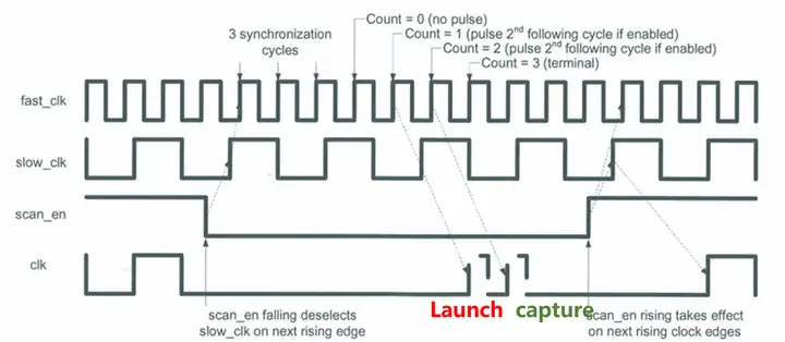 当我们进行capture操作时,scan enable信号要从1变为0,为了保证得到的是稳定的0信号,我们需要先经过sync cell的3个synchronization cycles。