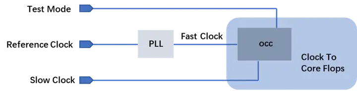 At-speed test已被证明是用来测试Delay Fault的有效方法,at-speed test就是让芯片在内部高速时钟上测试,但是该测试方法在fast capture mode下需要两个时钟脉冲,第一个时钟需要使得前一个scan flip-flop的值进行翻转来激活故障,第二个时钟需要使得前一个scan flip-flop的翻转值传播到后一个scan flip-flop,从而实现故障传播。这两个时钟来自于function clock,因此需要通过I/O pad提供这些at-speed clock脉冲,但是I/O pad可以支持的最大频率存在限制,OCC电路应运而生。
