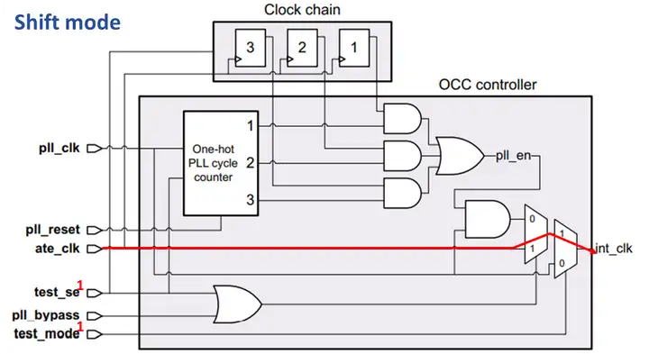 当OCC处于shift mode时,我们在ate clock的控制下将测试向量load进internal scan chain和clock chain内,所以test mode = 1,scan_en = 1,此时ate _clk选通,完成shift操作。