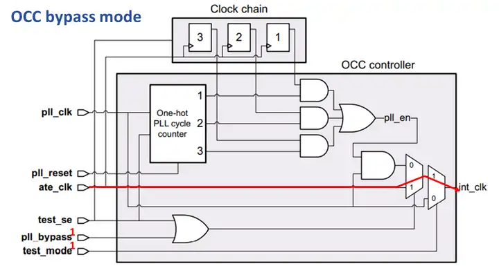 Synopsys的OCC 1.0 没有真正的slow capture mode,需要做stuck-at 测试时,可以直接从ATE机台提供OCC bypass mode capture clock。通过外部ATE机台对ate clock的pulse进行适当的控制就可以进行stuck-at测试,不需要clock chain的控制。此时test mode = 1,pll_bypass = 1。