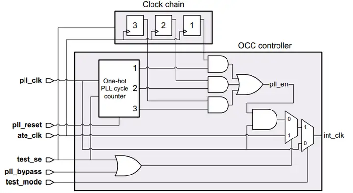 片上时钟控制器(On-chip Clock Controllers ,OCC),也称为扫描时钟控制器(Scan Clock Controllers,SCC)。OCC 是插在SoC上的逻辑电路。在ATE(自动测试设备)上对芯片做ATPG测试时,OCC用于控制内部scan flip-flop时钟。
