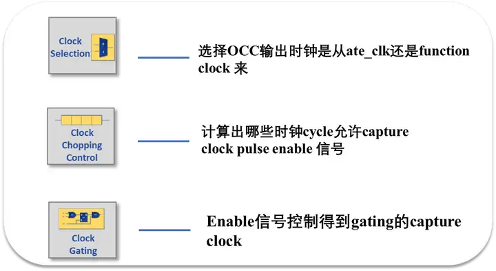 OCC电路可以实现ate clock和function clock之间的切换,并且控制在什么时刻跳转。所以standard的OCC在设计时需要拥有三个主要功能:clock selection, clock chopping control and clock gating。