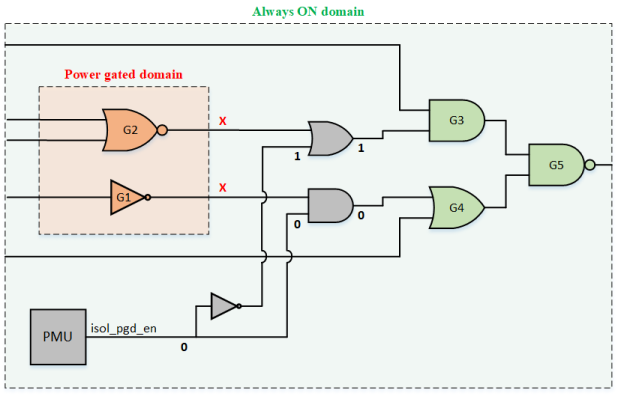 由于PMU管理设计中的所有电源门控,因此它在电源门控之前启用隔离使能信号,以确保在电源切断后没有“X”值传播到always on域。在上图中,isol_pgd_en是隔离使能信号,是一个有效的低信号。