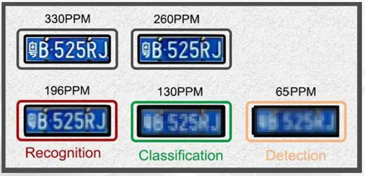 - 在我国一般采用国际单位体系,因此像素密度通常用PPM(pixels per meter)单位。在安防行业中,人们一般将图像质量从高到低分为5个等级,每个等级可以满足一定的应用需求,即