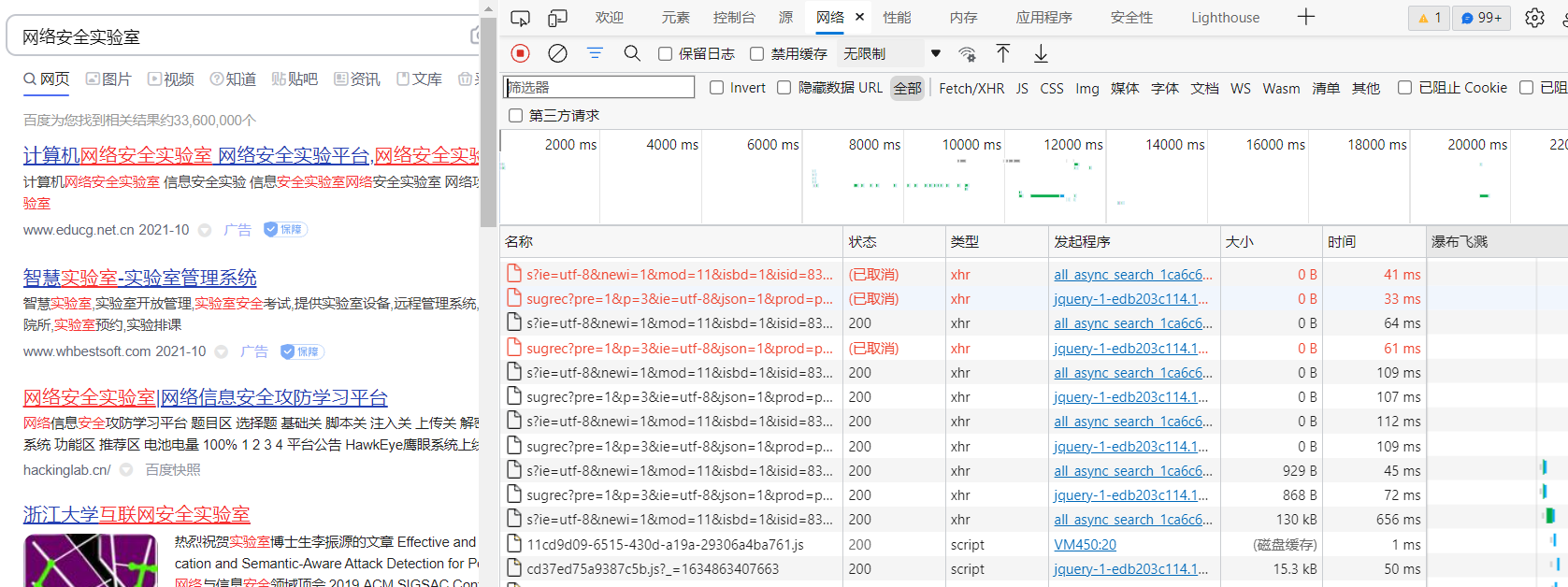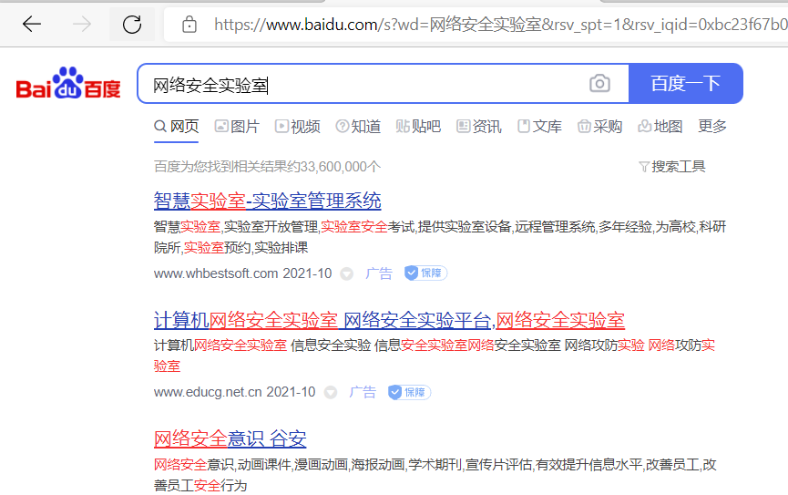 百度大家应该都用过,我们可以在百度查找一些想要了解的信息。但是我们需要告诉它,我们想要查找什么内容,这就需要我们告诉服务器我们需要查找与什么相关的内容,所以我们需要在搜索框输入我们想要查找的信息的关键字,这里输入的关键字就是给百度的服务器传入参数(以后简称传参),百度的服务器在接收了这个参数后,进行了一些处理,然后返回相关数据,比如我们输入“网安实验室”,百度就会给我们返回与“网安实验室”相关度较高的网页,如图:
