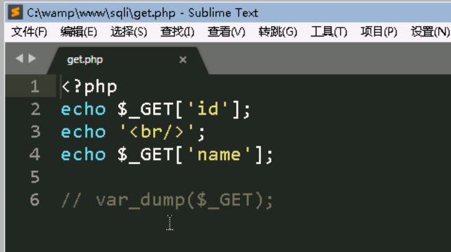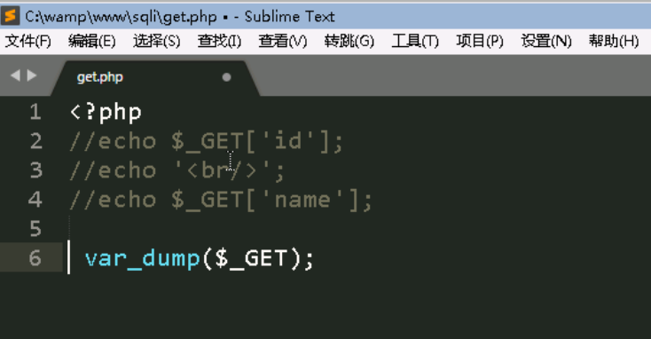 首先进入C:\wamp\www\sqli目录,打开get.php,把前面输出的代码注释掉(在英文输入状态下,在每行的最前面输入2个 / 表示注释掉这一行),把最后一行取消注释。改完以后的代码如图: