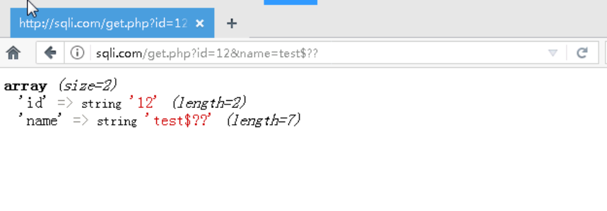 在实验环境中,已经配置了sqli.com域名,现在通过代码来看下如何获取用户传过来的参数。在实验环境中打开火狐浏览器,访问sqli.com/get.php?id=12&name=admin。以后涉及到需要访问sqli.com的步骤,都在试验机中完成。