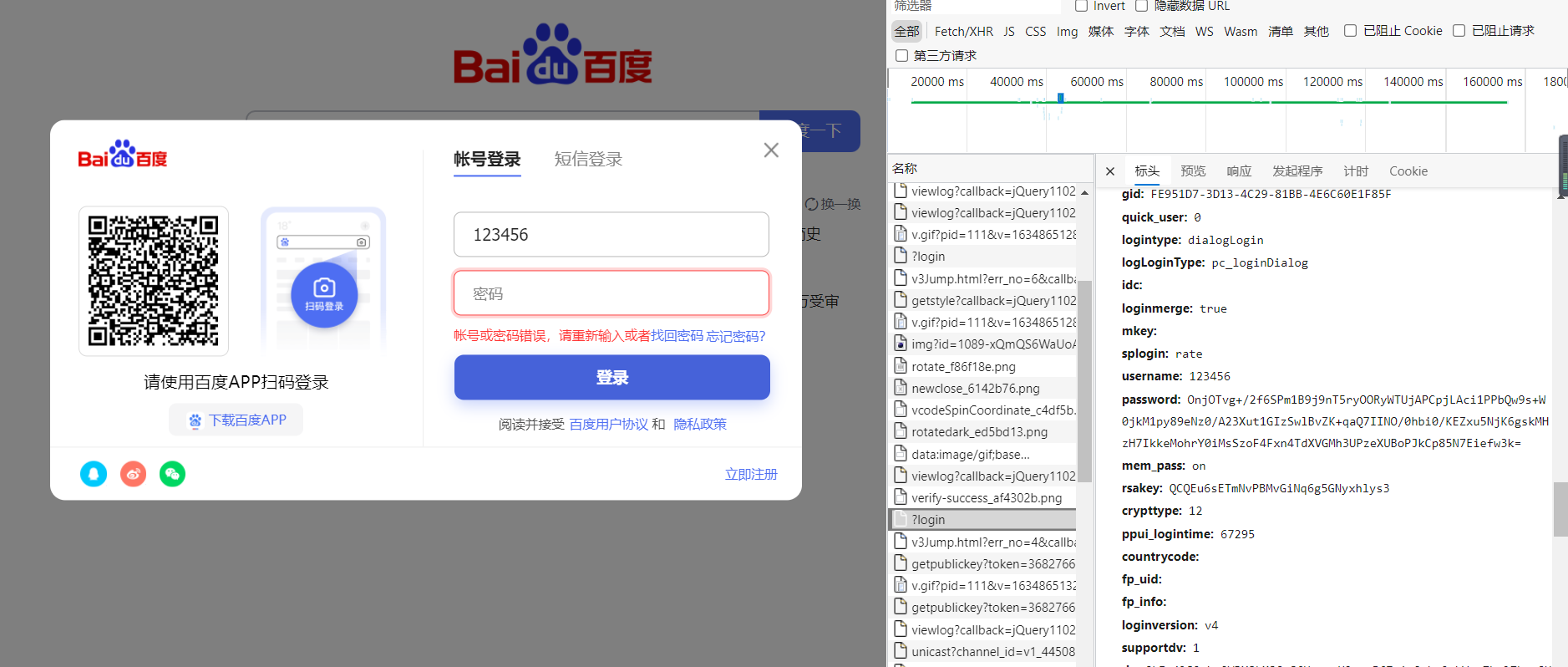 可以看到给服务器传了很多参数,而我们输入的只有2个,加上验证码也就三个参数,这说明百度自动带入了一些其他参数,在里面可以看到username、password这2个参数,从参数名我们就可以猜出分别代表我们输入的用户名和密码,但是输入的密码明明只有几个字符,为什么到这里就变成了一串很长的毫无规律的字符串呢? 这说明我们输入的密码是被加密后才被发送百度服务器。