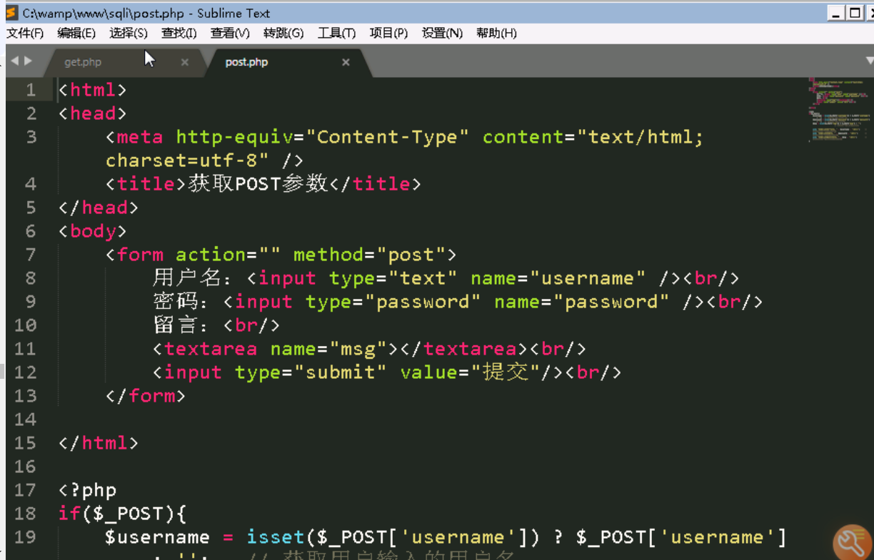 查看c:\wamp\www\sqli目录下的post.php的源码,如下图: