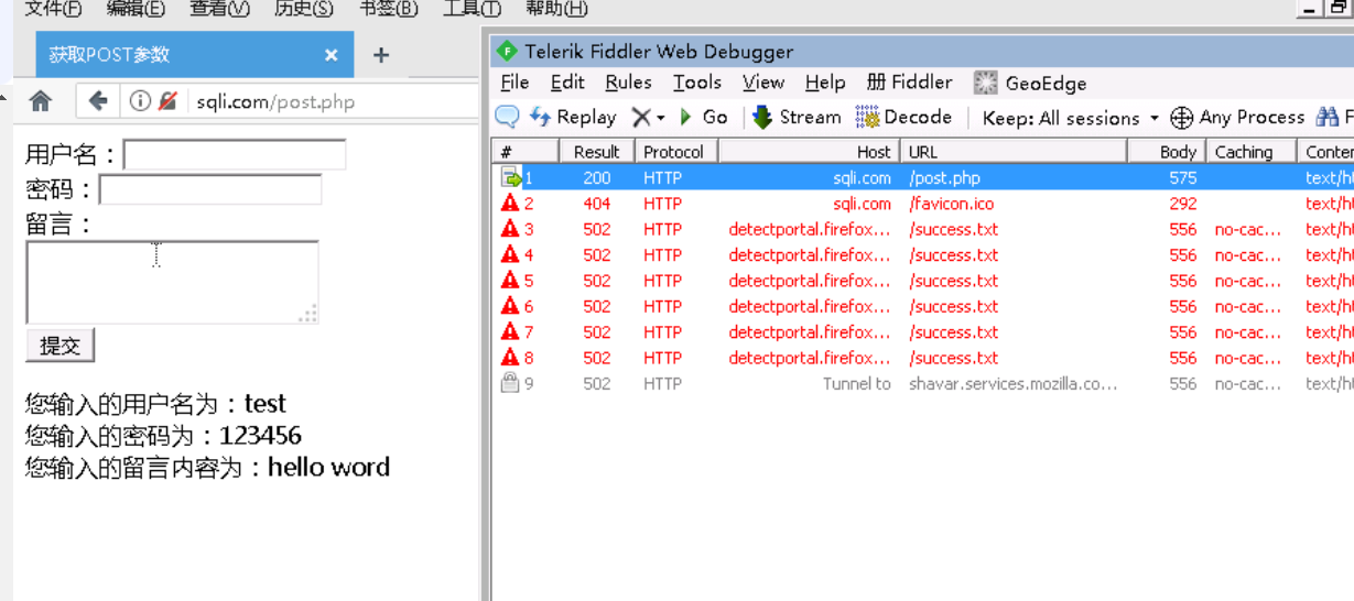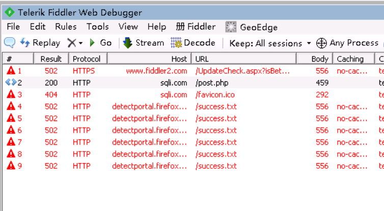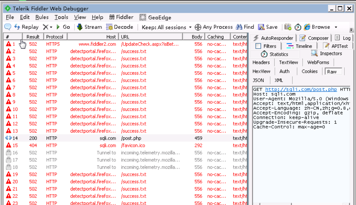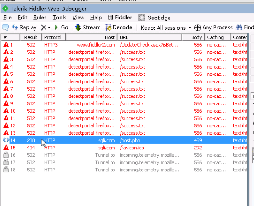 重新访问http://sqli.com/post.php,此时可以在fiddler看到我们刚才的请求,由于我们没有设置拦截请求,所以默认直接允许请求了。