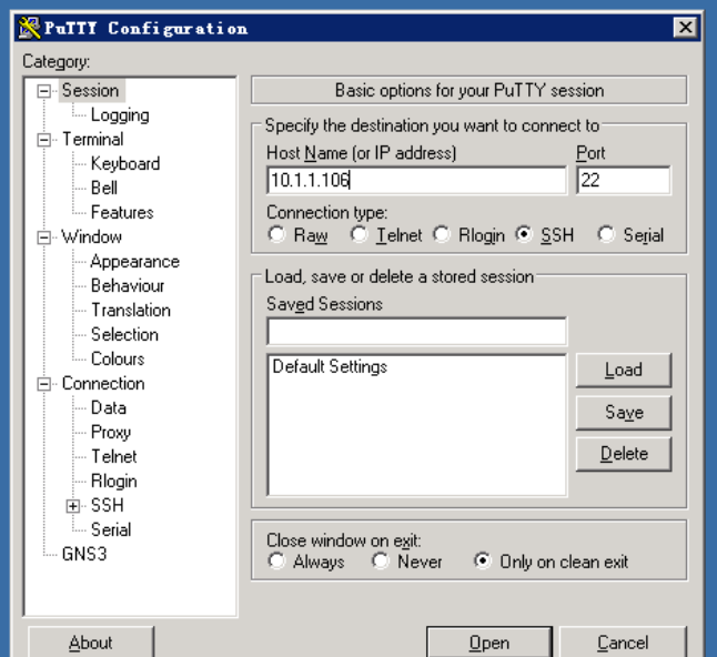 登录实验机后,打开桌面上的putty程序,输入10.1.1.106,再点击Open.。