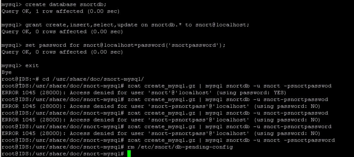 mysql> grant create, insert, select, update on snortdb.* to snort@localhost;