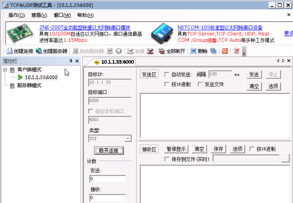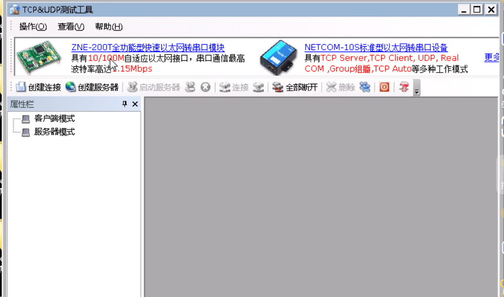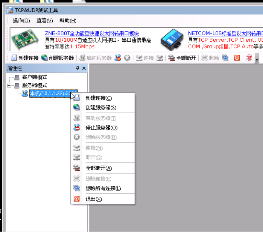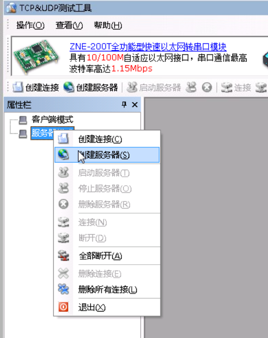 选择10.1.1.33的机器,双击桌面的" TCP&UDP测试工具",右键点击服务器模式,在下拉列表中,选择创建服务器,如下图: