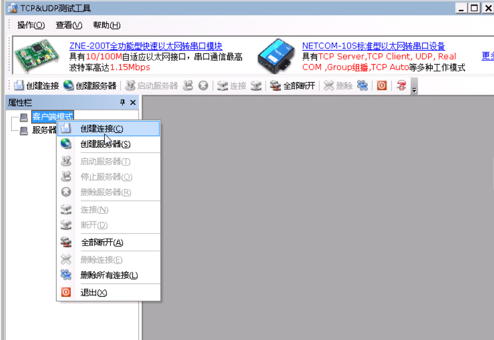选择10.1.1.142的机器,双击桌面的" TCP&UDP测试工具",右键点击客户端模式,在下拉列表中,选择"创建连接",如下图: