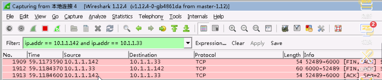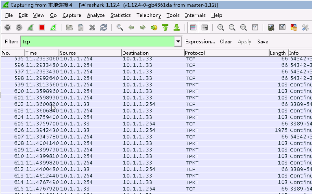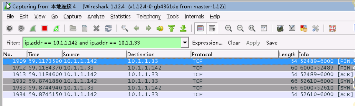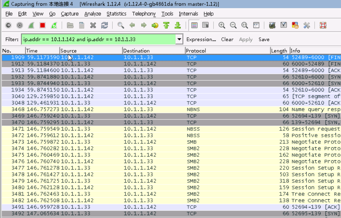 我们可以看到,有很多的数据,不方便查看。在这里,我们已知两台机器的IP情况下,可以在filter中输入"ip.addr == 10.1.1.142 and ip.addr == 10.1.1.33"来过滤出我们想要的数据,点击工具中的"连接"按钮。如下图