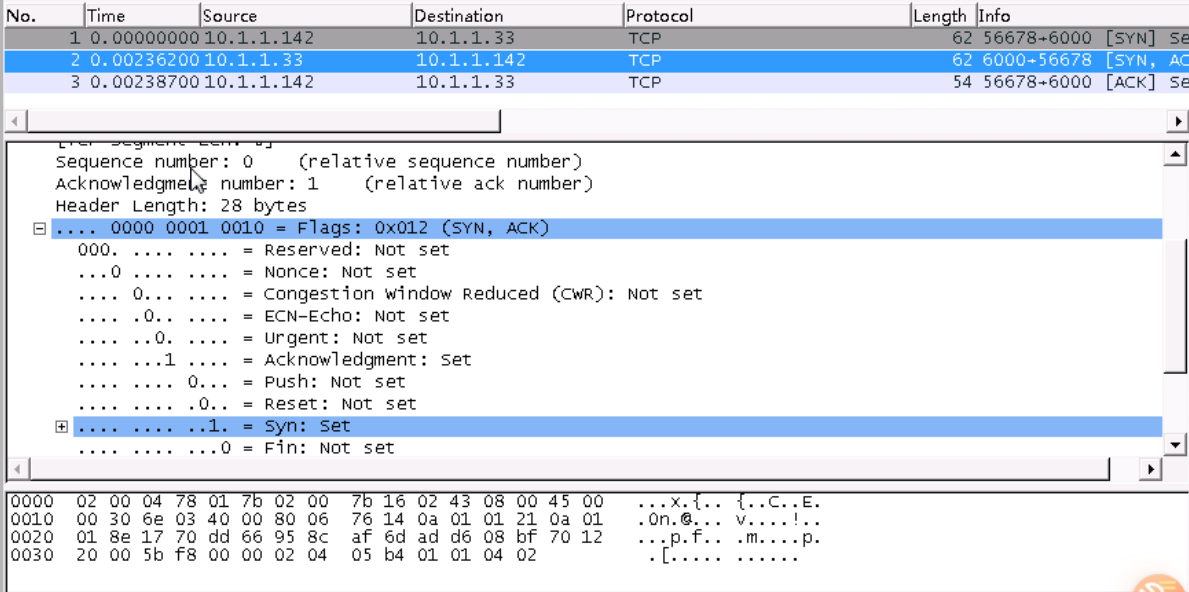 SYN:表示同步序号,用来建立连接。SYN 标志位和ACK标志位搭配使用,当连接请求的时候,SYN=1,ACK=0;当连接被响应的时候,SYN=1,ACK=1。这个标志的数据包经常被用来进行端口扫描。扫描者发现一个只有SYN的数据包,如果对方主机响应了一个数据包回来,就表面该主机存在这个端口;但是由于这种扫描方式只是进行TCP三次握手的第一次握手,因此这种扫描成功表示扫描的机器不安全。因为一个安全的主机,将会强制要求一个链接严格的进行TCP的三次握手。