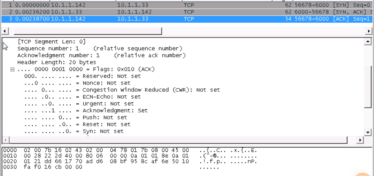 以上描述的详细信息是服务器收到请求后,发给客户端的确认包(SYN+ACK)。根据以上描述,可以看到在该帧数据包中包含这个主机初始的序列号0,以及一个确认号1。这个确认号比之前那个数据包(1帧数据包)序列号大1,是因为该域是用来表示主机所期望得到的下一个序列号的值。