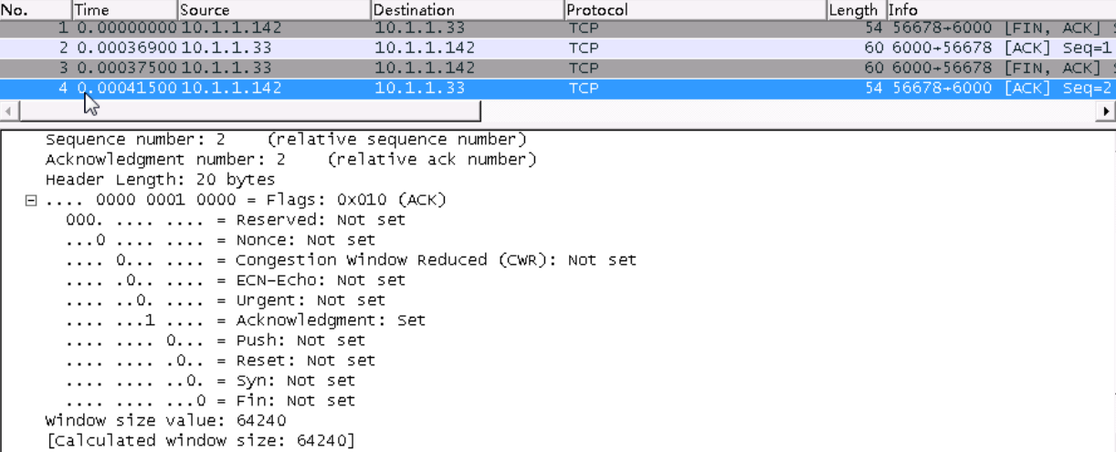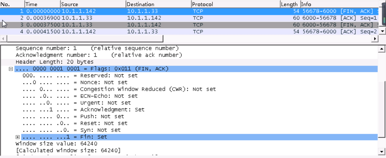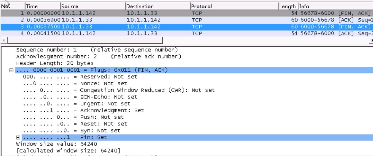 通过以上信息的描述,可以看到客户端向服务器发送FIN和ACK标志的数据包开始断开连接,其中FIN和ACK标志位都为1.