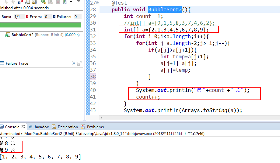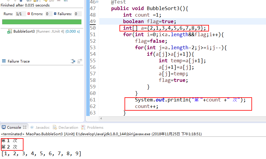 1 @Test 2 public void BubbleSort1(){ 3 int count =1; 4 int[] a={9,1,5,8,3,7,4,6,2}; 5 for(int i=0;i<a.length;i++){ 6 for(int j=i+1;j<a.length;j++){ 7 if(a[i]>a[j]){ 8 int temp=a[j]; 9 a[j]=a[i]; 10 a[i]=temp; 11 System.out.println("第 "+count +" 次"); 12 count++; 13 } 14 } 15 } 16 System.out.println(Arrays.toString(a)); 17 }