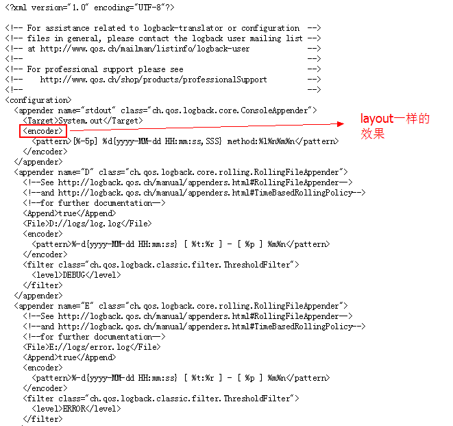 1 ===========log4j示例=========== 2 ### 设置### 3 log4j.rootLogger = debug,stdout,D,E 4 5 ### 输出信息到控制抬 ### 参考log4j文档写 6 log4j.appender.stdout = org.apache.log4j.ConsoleAppender 7 log4j.appender.stdout.Target = System.out 8 log4j.appender.stdout.layout = org.apache.log4j.PatternLayout 9 log4j.appender.stdout.layout.ConversionPattern = [%-5p] %d{yyyy-MM-dd HH:mm:ss,SSS} method:%l%n%m%n 10 11 ### 输出DEBUG 级别以上的日志到=D://logs/error.log ### 12 log4j.appender.D = org.apache.log4j.DailyRollingFileAppender 13 log4j.appender.D.File = D://logs/log.log 14 log4j.appender.D.Append = true 15 log4j.appender.D.Threshold = DEBUG 16 log4j.appender.D.layout = org.apache.log4j.PatternLayout 17 log4j.appender.D.layout.ConversionPattern = %-d{yyyy-MM-dd HH:mm:ss} [ %t:%r ] - [ %p ] %m%n 18 19 ### 输出ERROR 级别以上的日志到=D://logs/error.log ### 20 log4j.appender.E = org.apache.log4j.DailyRollingFileAppender 21 log4j.appender.E.File =E://logs/error.log 22 log4j.appender.E.Append = true 23 log4j.appender.E.Threshold = ERROR 24 log4j.appender.E.layout = org.apache.log4j.PatternLayout 25 log4j.appender.E.layout.ConversionPattern = %-d{yyyy-MM-dd HH:mm:ss} [ %t:%r ] - [ %p ] %m%n 26 27 ===========logback============