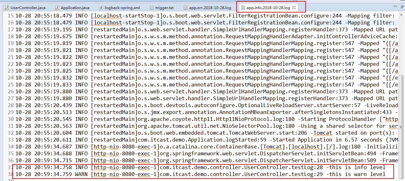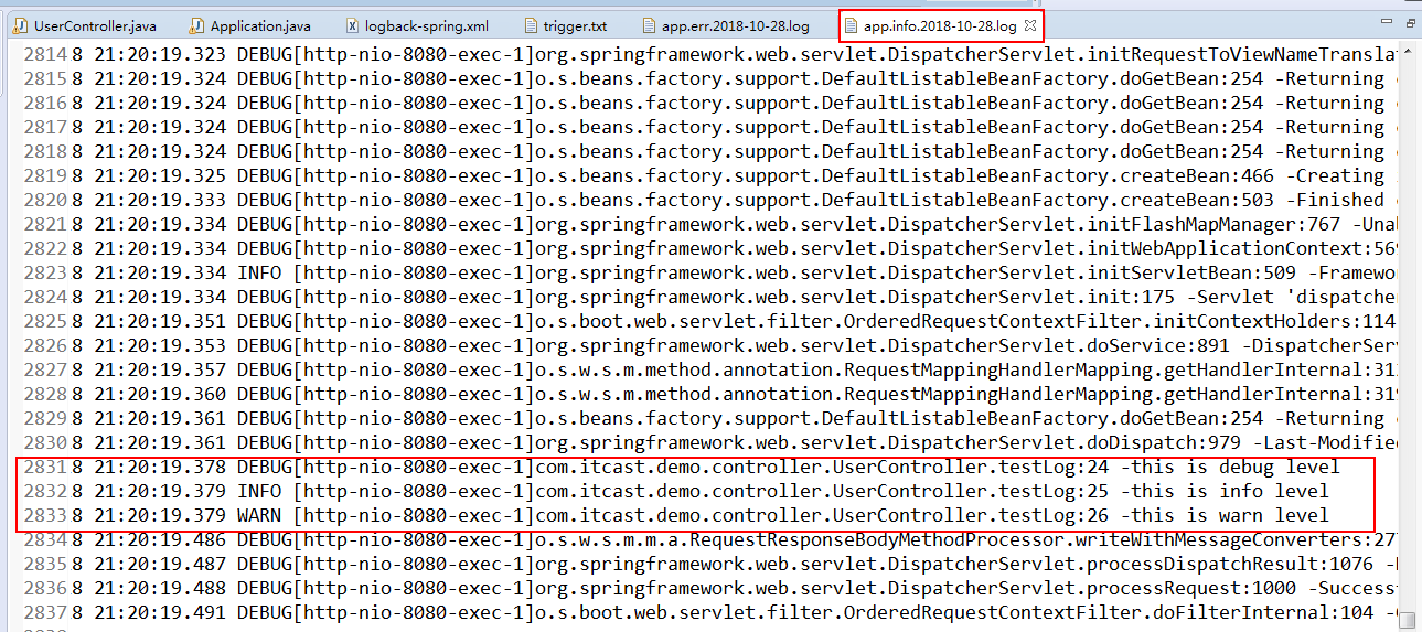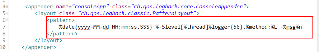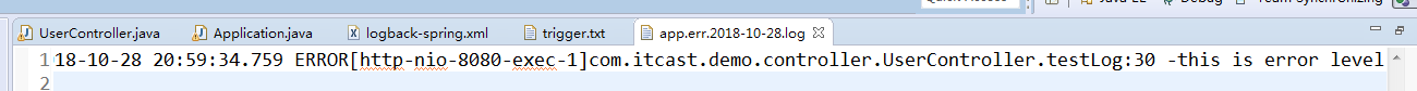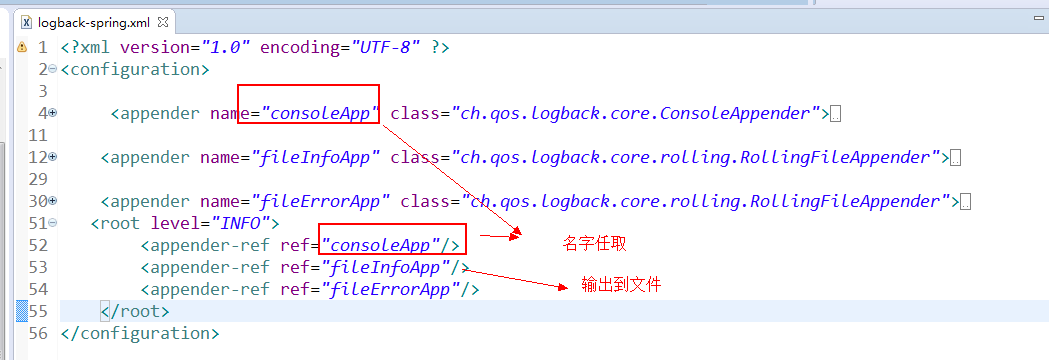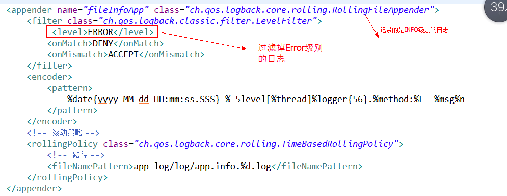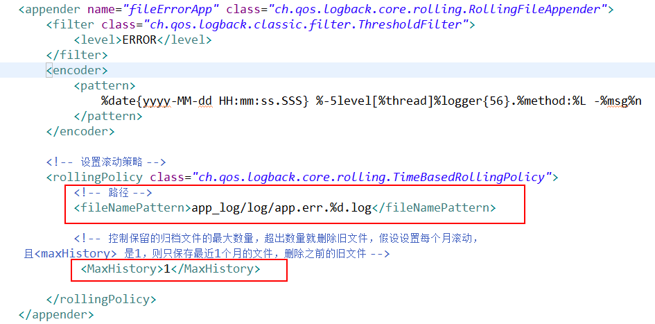 1 <?xml version="1.0" encoding="UTF-8" ?> 2 <configuration> 3 4 <appender name="consoleApp" class="ch.qos.logback.core.ConsoleAppender"> 5 <layout class="ch.qos.logback.classic.PatternLayout"> 6 <pattern> 7 %date{yyyy-MM-dd HH:mm:ss.SSS} %-5level[%thread]%logger{56}.%method:%L -%msg%n 8 </pattern> 9 </layout> 10 </appender> 11 12 <appender name="fileInfoApp" class="ch.qos.logback.core.rolling.RollingFileAppender"> 13 <filter class="ch.qos.logback.classic.filter.LevelFilter"> 14 <level>ERROR</level> 15 <onMatch>DENY</onMatch> 16 <onMismatch>ACCEPT</onMismatch> 17 </filter> 18 <encoder> 19 <pattern> 20 %date{yyyy-MM-dd HH:mm:ss.SSS} %-5level[%thread]%logger{56}.%method:%L -%msg%n 21 </pattern> 22 </encoder> 23 <!-- 滚动策略 --> 24 <rollingPolicy class="ch.qos.logback.core.rolling.TimeBasedRollingPolicy"> 25 <!-- 路径 --> 26 <fileNamePattern>app_log/log/app.info.%d.log</fileNamePattern> 27 </rollingPolicy> 28 </appender> 29 30 <appender name="fileErrorApp" class="ch.qos.logback.core.rolling.RollingFileAppender"> 31 <filter class="ch.qos.logback.classic.filter.ThresholdFilter"> 32 <level>ERROR</level> 33 </filter> 34 <encoder> 35 <pattern> 36 %date{yyyy-MM-dd HH:mm:ss.SSS} %-5level[%thread]%logger{56}.%method:%L -%msg%n 37 </pattern> 38 </encoder> 39 40 <!-- 设置滚动策略 --> 41 <rollingPolicy class="ch.qos.logback.core.rolling.TimeBasedRollingPolicy"> 42 <!-- 路径 --> 43 <fileNamePattern>app_log/log/app.err.%d.log</fileNamePattern> 44 45 <!-- 控制保留的归档文件的最大数量,超出数量就删除旧文件,假设设置每个月滚动, 46 且<maxHistory> 是1,则只保存最近1个月的文件,删除之前的旧文件 --> 47 <MaxHistory>1</MaxHistory> 48 49 </rollingPolicy> 50 </appender> 51 <root level="INFO"> 52 <appender-ref ref="consoleApp"/> 53 <appender-ref ref="fileInfoApp"/> 54 <appender-ref ref="fileErrorApp"/> 55 </root> 56 </configuration>
