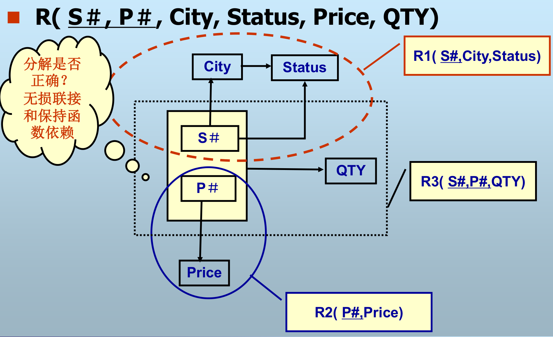 模式分解定义:\(R(U)\) 分解为 \(R1(U1),...,Rk(Uk)\),\(R1,...,Rk\) 称为一个分解