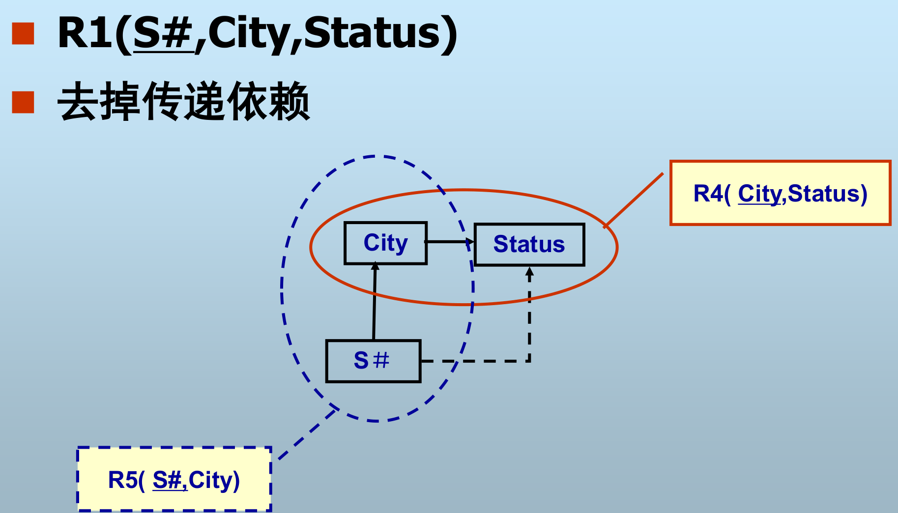 - 传递依赖:若 Y→X,X→A,并且 \(X\nrightarrow Y\),A 不是 X 的子集,则称 A 传递依赖于 Y