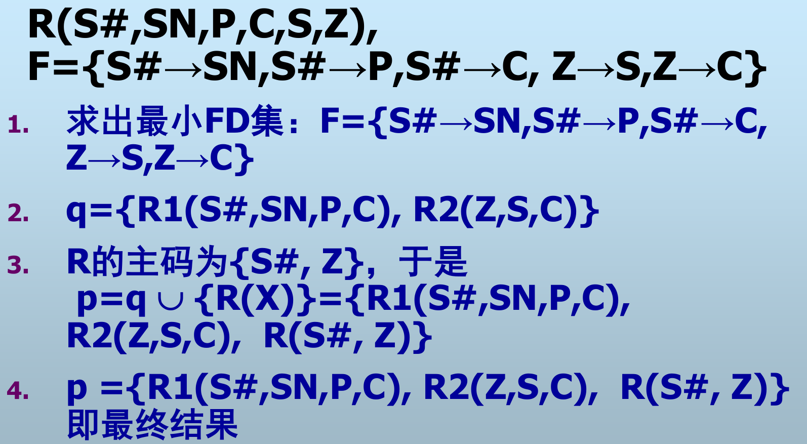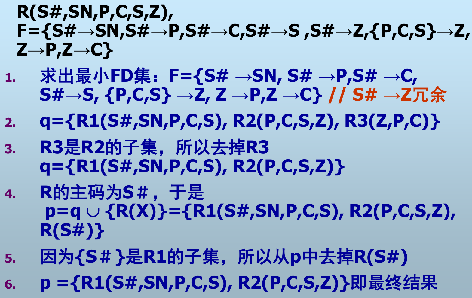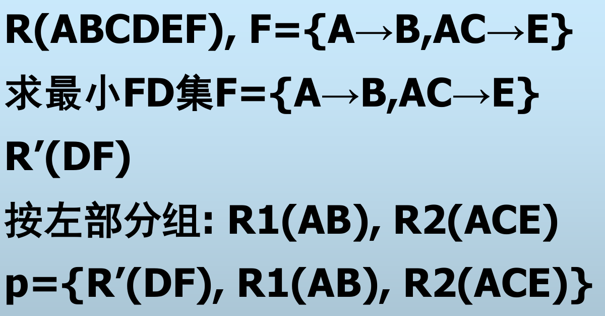 - 对 F 按照左部分分组,将每组涉及的所有属性作为一个关系模式输出。如果某个关系模式 \(Ri\) 的属性集是另一个关系模式的属性集的子集,则在结果中去掉 \(Ri\) 。最后输出 \(p=\{R1,R2,...,Rk,R'\}\)