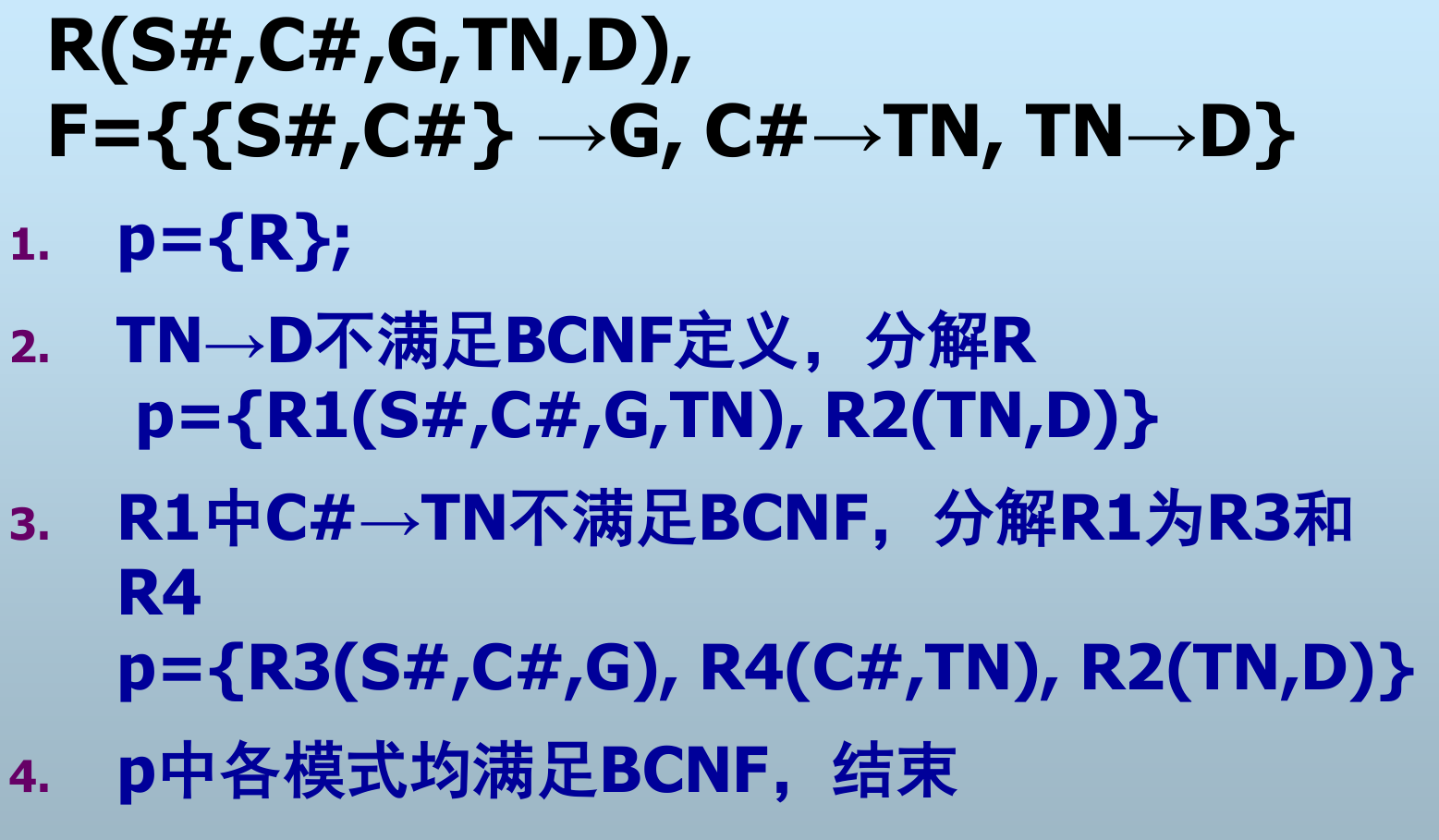 - BCNF:如果关系模式 R 的所有不平凡的、完全的函数依赖的决定因素(左边的属性集)都是候选码,则 R∈BCNF