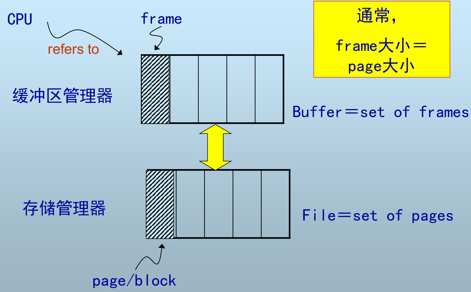 - frame 是 buffer 中的单位;page/block 是内存/磁盘的单位