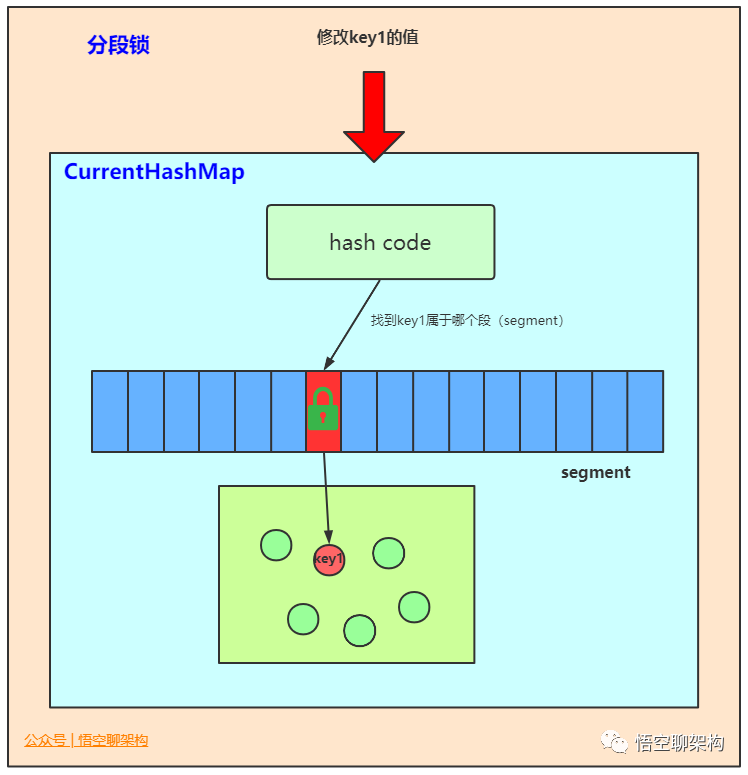 分段锁是一种机制: 最好的例子来说明分段锁是ConcurrentHashMap。ConcurrentHashMap原理:它内部细分了若干个小的 HashMap,称之为段(Segment)。默认情况下一个 ConcurrentHashMap 被进一步细分为 16 个段,既就是锁的并发度。如果需要在 ConcurrentHashMap 添加一项key-value,并不是将整个 HashMap 加锁,而是首先根据 hashcode 得到该key-value应该存放在哪个段中,然后对该段加锁,并完成 put 操作。在多线程环境中,如果多个线程同时进行put操作,只要被加入的key-value不存放在同一个段中,则线程间可以做到真正的并行。
