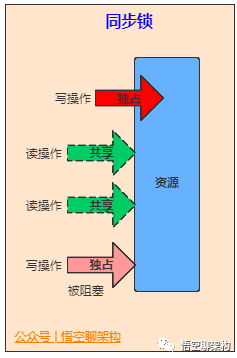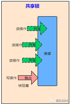 如上图所示,只能有一个线程进行读操作或者写操作,其他线程的读写操作均不能进行。