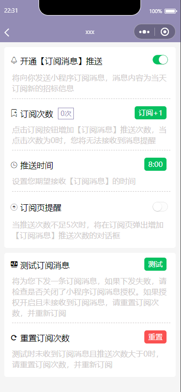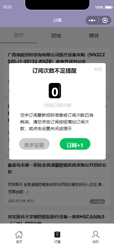 点击订阅按钮增加【订阅消息】推送次数,当点击次数为0时,您将无法接收到消息提醒