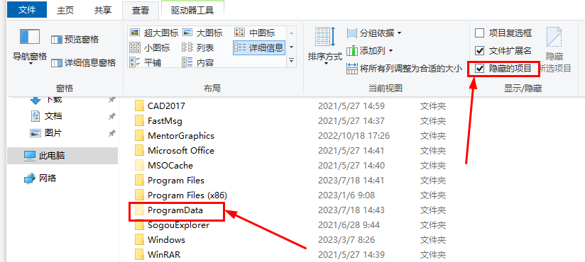 点击查看,选中隐藏的的项目,将指定的文件夹,显示出来。