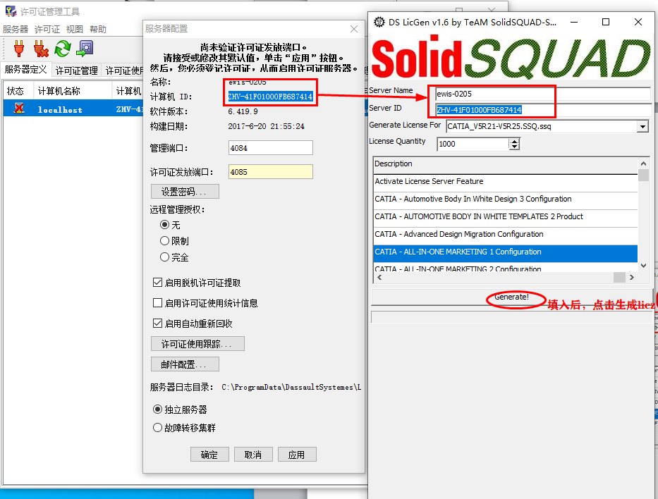 第四步解决方案,在任意一台电脑上运行该软件DSLS.LicGen.v1.6.SSQ.exe,输入第三步解决方案得到的,计算机名和计算机ID。生成的计算机licz再复制到原来的计算机上,从第五步开始。从而完成破解。