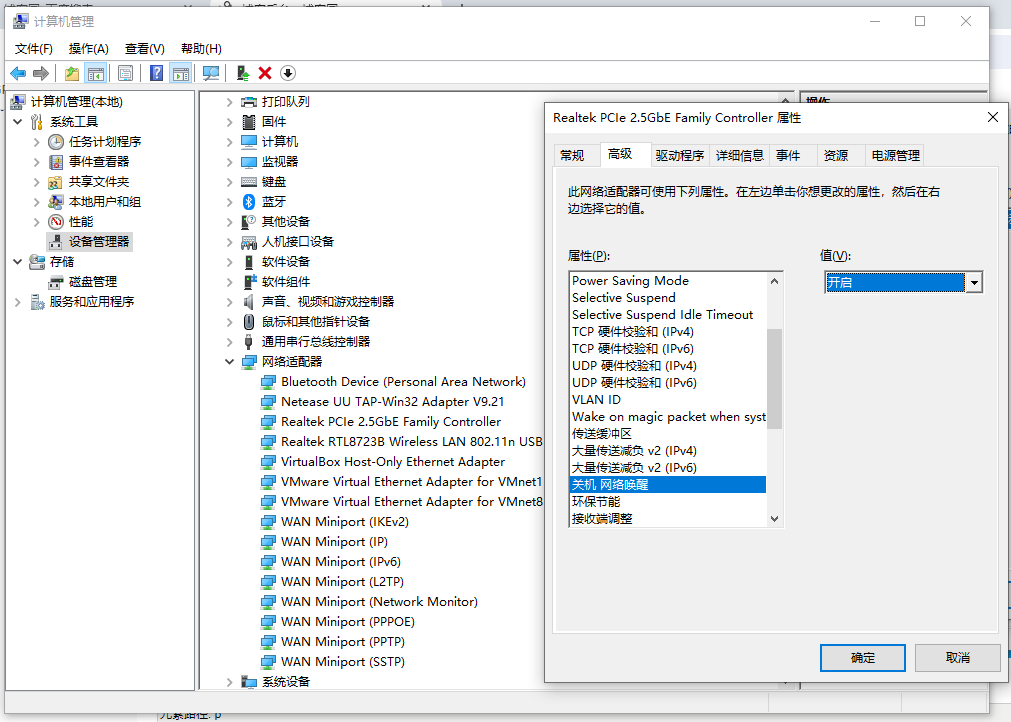 更改为【开启】并【确定】。那么在完全关机状态下,任可以唤醒开机。